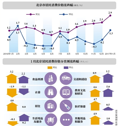新京报讯 (记者沙璐)国家统计局北京调查总队昨日公布了2017年1月份北京市居民消费价格变动情况,数据显示,CPI同比上涨2.9%,环比上涨1.3%。受节假日因素影响,主要食品、旅游等价格明显上涨。