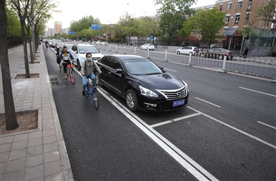 新京报讯 (记者郭超)近日,一种新式“内嵌式”路侧停车位出现在石景山区。与过去的路侧停车位不同,该路侧车位不再紧靠马路牙子,而是挪到靠近机动车道的位置,即停车位充当了自行车道和机动车道之间的“隔离带”。据悉,这是石景山交通支队在试点,旨在保障自行车无障碍通行。
