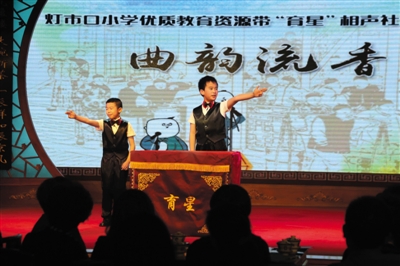 东城区灯市口小学优质教育资源带“育星”相声社在老舍茶馆举行首场演出。灯小“育星”相声社成立于2014年,演员几乎都是学校相声校本课程培养的“零基础”学生,他们也是北京市中小学中首个登上曲艺专业舞台进行相声专场演出的学生团体。