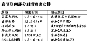 新京报讯 (记者杜丁)2014年春节期间(1月30日-2月6日)北京将举行100台、400场各类专业院团文艺演出。昨天在市文化局举办的新闻发布会上,首都剧院联盟副秘书长沈春友表示,春节期间,30余家剧院将推出20-80元不等的“低票价”。