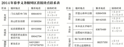 新京报讯 (记者饶沛)首都绿化办昨天召开新闻发布会,2014年,全市各区县设立春季义务植树接待点21处,包括门头沟区中门寺、房山区张坊镇等。各植树点多在4月5日北京义务植树日,迎来社会单位和个人植树高峰。