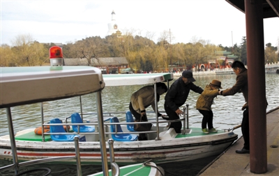 昨日,北海公园,游客们在南岸码头乘船,当天北海公园游船正式开航,8个码头开放。昨天正式下水开船的还有颐和园、紫竹院和玉渊潭三大公园。 新京报记者薛珺 饶沛 摄影报道
