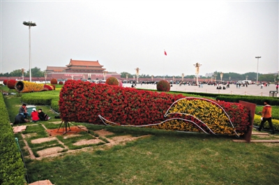 新京报讯 (记者饶沛)为迎接“五一”小长假的到来,天安门广场花卉已经开始摆放,预计明天可以完工。本着节俭的原则,今年花坛的摆设与去年基本相同。这些花卉将摆放到“十一”之后。