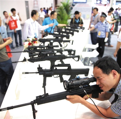 昨日,第七届中国国际警用装备博览会在北京国家会议中心开幕,观众正在“试用”枪支。