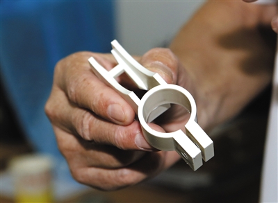 “马桶原水箱不做任何改动,只需几分钟时间,将这个‘节水器’安装在水箱中,一个普通马桶就能变成节水型马桶。”5月26日下午,在位于花家地西里的节水工作室中,金九皋一手拿着马桶水箱模型,一手拿着自制马桶节水器,进行着讲解。