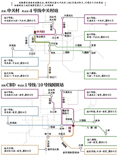 新京报讯 (记者林野)周一开始,北京地铁将开始调整各地铁车站的票价标识。昨日记者获悉,北京地铁首次发布了票价信息图,该图以张自忠路站为例,用不同颜色标注该站到其他地铁站的票价,各地铁站也将陆续推出。该图显示7号线双井站暂缓开通。