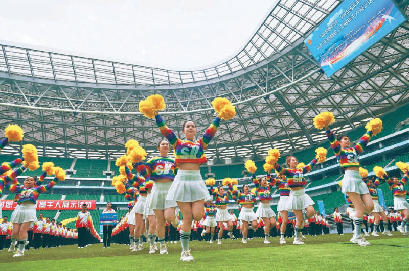 约1500名企业职工代表、劳动群体代表,身着运动服,精神抖擞地在新工体碧绿的草坪上,共同做起第九套广播体操。这场2023年首都职工工间操千人展示活动,也成为工人体育场改造复建完工后举办的首场大型职工群众性体育活动。 本报记者 程功 摄