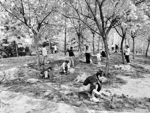 北三环太阳宫桥东北角,一处大众花园进行景观升级。33组亲子家庭及20多名志愿者为小花园栽花种草,植树尽责。