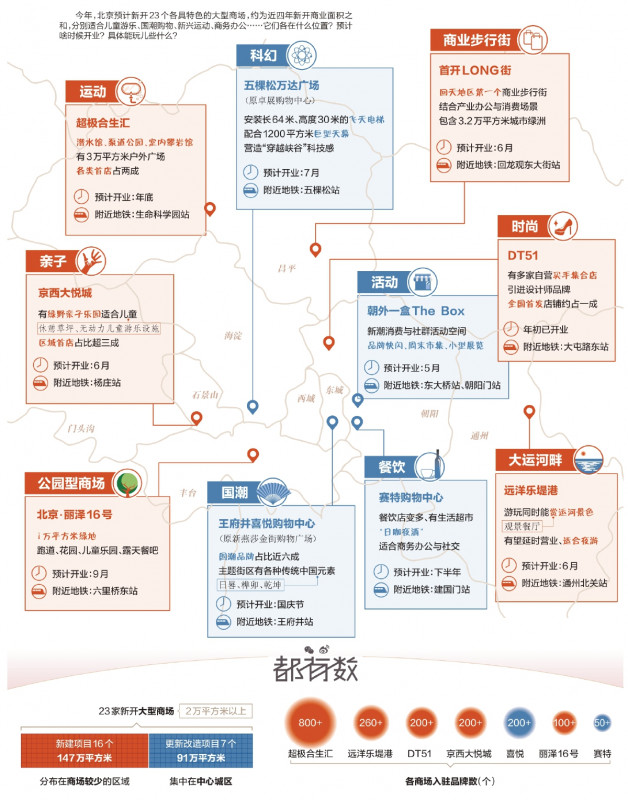 今年,北京预计新开23个各具特色的大型商场,约为近四年新开商业面积之和,分别适合儿童游乐、国潮购物、新兴运动、商务办公……它们各在什么位置?预计啥时候开业?具体能玩儿些什么?