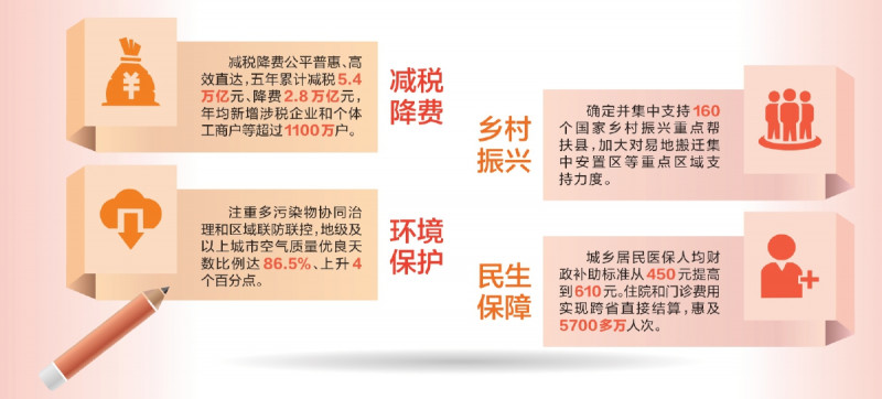 减税降费公平普惠、高效直达,五年累计减税5.4万亿元、降费2.8万亿元,年均新增涉税企业和个体工商户等超过1100万户。