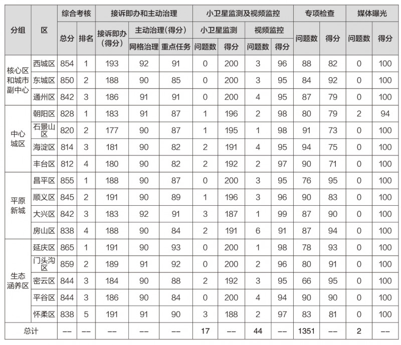 2023年1月份,首都环境建设管理办按照《关于印发首都城市环境建设管理考核评价工作方案的通知》(首环建管〔2022〕1号)要求,围绕“接诉即办”和主动治理400分,小卫星监测及视频监控300分,专项检查200分,媒体曝光100分四个方面,采取千分制扣分开展考核,并按综合考核得分进行排名。