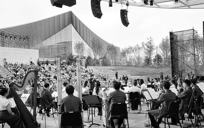 沿着惠林路走进城市绿心公园深处,树荫中探出北京艺术中心一角飞起的屋檐。循着指示路牌向前,踏过依然在紧张建设的工地,一座下沉式的露天剧场豁然呈现,镶嵌在一片绿色之中。20日下午,2023年国家大剧院“五月音乐节”公益演出走进了北京艺术中心绿心露天剧场。