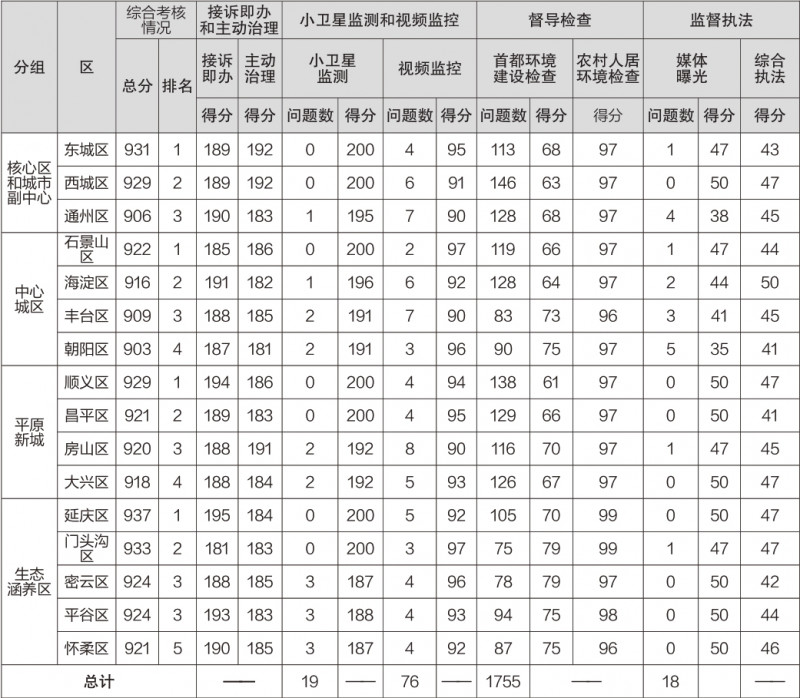 自2023年2月份起,首都环境建设管理办围绕“接诉即办”和主动治理(400分)、小卫星监测和视频监控(300分)、督导检查(200分)、监督执法(100分)四个方面,采取千分制扣分开展考核,并按综合考核得分进行排名。