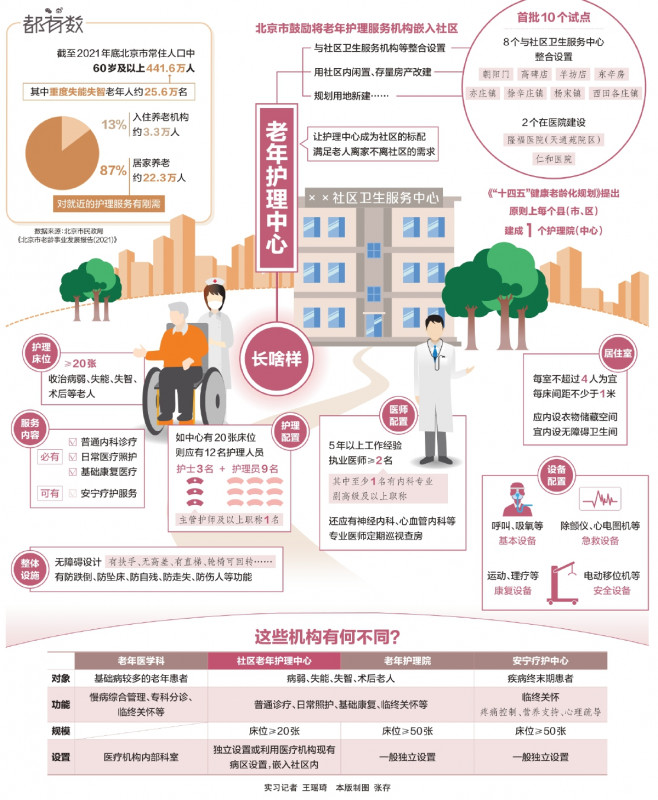 北京市首批10家嵌入社区的老年护理中心日前陆续开诊,社区里的病弱、失能、失智、术后老人可入住接受日常照护、普通诊疗、康复医疗等服务。这些中心如何做到“嵌入社区”?由哪些专业人员组成?与老年医学科、老年护理院、安宁疗护中心等有何区别?