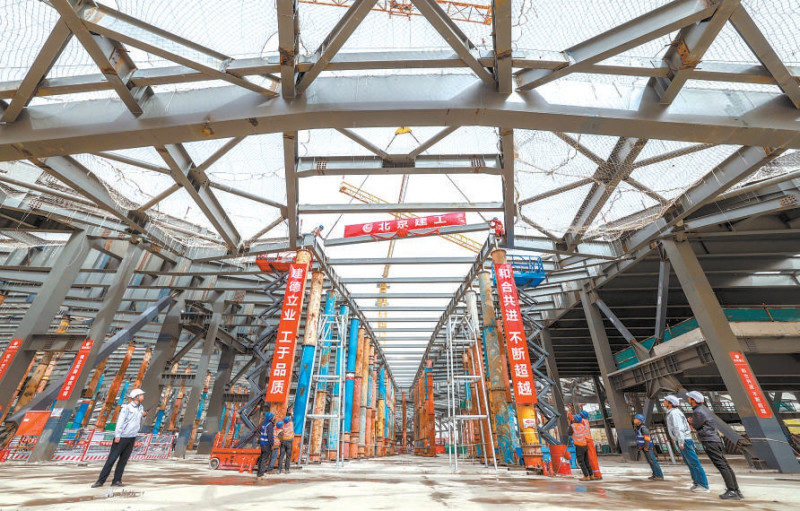 昨天,在中关村论坛永久会址工程施工现场,随着最后一根结构钢梁稳稳吊装就位,标志着钢结构全面封顶,“三叶草”造型的基础骨架正式成型。