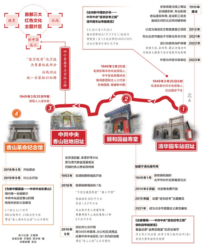 清华园车站旧址上周末对公众开放,一件件饱含深情的文物将人们带回74年前——1949年3月,毛泽东和中共中央离开西柏坡“进京赶考”,抵京第一站即为清华园车站。党的十八大以来,北京保护修缮这条赶考路上的旧址,四个重要节点首批立牌,为后来者触摸这段历史提供最鲜活的媒介。