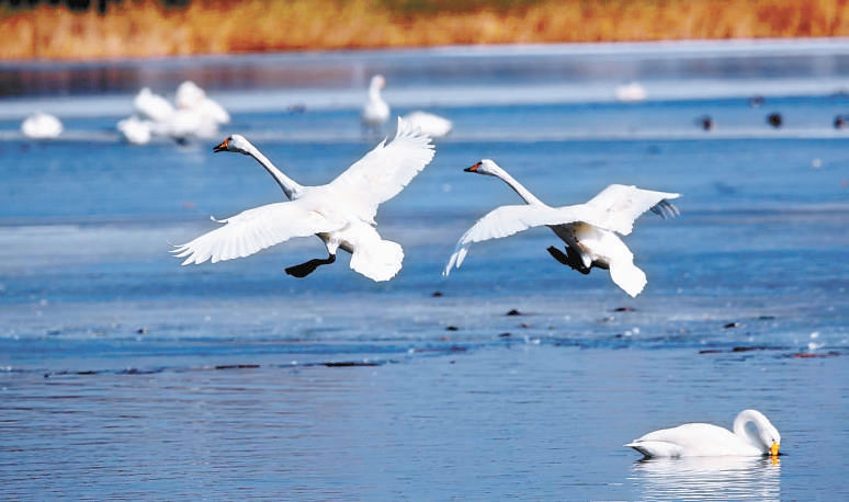 冰消河开,候鸟们浩浩荡荡地飞越大山大河,从南方越冬地回归北方繁殖地。近日,北京黑豹野生动物保护站的工作人员发现,由10只国家二级保护动物大天鹅组成的“先头部队”已抵达房山区拒马河流域。