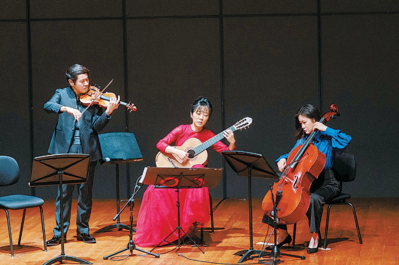 上半场,埃托尔·维拉-罗伯斯《第五号弦乐四重奏》的选段为音乐会开篇,基调优雅。踏着轻盈的余韵,身穿红裙的杨雪霏现身。在埃托尔·维拉-罗伯斯《伤感的旋律》、埃格贝托·吉斯蒙蒂《水与酒》等作品中,她的吉他与大、中、小提琴不断组合,细腻悠长;下半场,打击乐与低音提琴换下弦乐四重奏,杨雪霏换上蓝裙。从《狂欢节的早晨》到《来自依班尼玛的女孩》再到《温柔的雨》和《空旷的城市》,路易斯·邦法、安东尼奥·卡洛斯·乔宾、巴登·鲍威尔等巴西音乐家的旋律接连上演,吉他成为真正的主角,“文化熔炉”巴西的灵魂在琴弦上自由而热烈地跳跃……