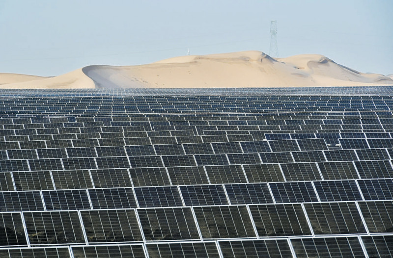 这是2月18日在武威市凉州区九墩滩光伏治沙示范园区拍摄的一处光伏发电项目(无人机照片)。