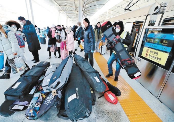 冬奥会后首个滑雪季,京张高铁成为前往崇礼等滑雪胜地游客的热门选择。每天,这趟“滑雪专列”都会运送大批乘客及滑雪装备到达目的地。(资料图)本报记者 安旭东摄