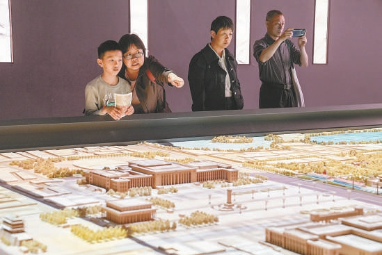 昨天,在首都博物馆,参观者夜览“辉煌中轴”展,在中轴线沙盘前驻足观赏。 本报记者 武亦彬摄