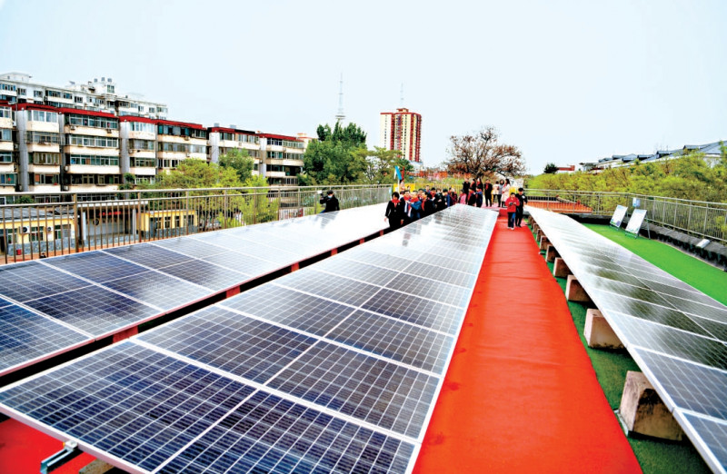 昨天,本市首家碳中和试点校在大兴区第八小学揭牌。该校充分开发利用屋顶闲置空间,安装光伏发电系统,装机容量500千瓦,日最高发电量800余千瓦时。 本报记者 和冠欣摄