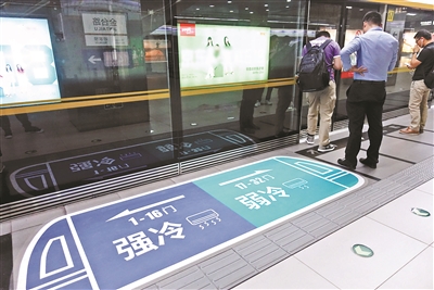 6月17日,北京青年报记者在地铁6号线车站看到,站台上新贴了不同车厢空调“冷热分区”的地贴,吸引了不少乘客围观。