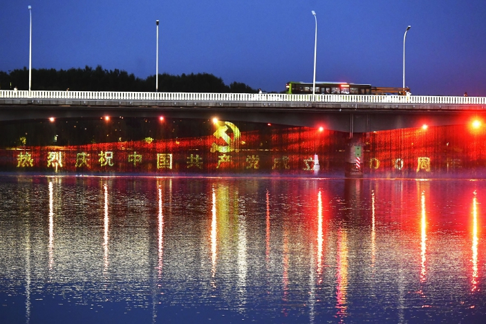 北运河大桥灯光秀在长达170米长的水幕上,采用22台激光投影机投射出整幅庆祝建党100周年的多媒体水幕秀。灯光秀结合重点革命遗迹,搭配红绸浮动,通过奋斗历史雕塑、旗帜、丰碑等元素展现中国共产党百年奋斗光辉历史,庆贺百年华诞。具体开启周期为6月28日至7月4日,播放位置为北运河大桥,播放时间为每晚20:15、20:45、21:15,共播放3次。