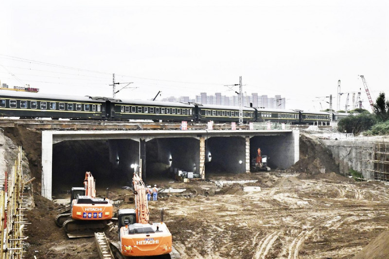 昨天13时30分,在位于东六环与城市副中心站工程中间位置,正在运营的京哈铁路线下方,4台油泵、60台油镐结束连续7天的运转作业,将重达11200吨的四孔框构桥顶推就位。工人们摇旗欢呼,拿着写有“建功京津冀服务副中心”的横幅拍照留影。