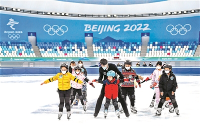2022-2023北京冰雪运动消费季活动启动仪式昨日下午在国家速滑馆举办。本次启动仪式先后发布了2023年北京冰雪消费地图、北京健身消费地图。据悉,活动将持续到2023年3月底。图为孩子们体验冰上冠军公益课。
