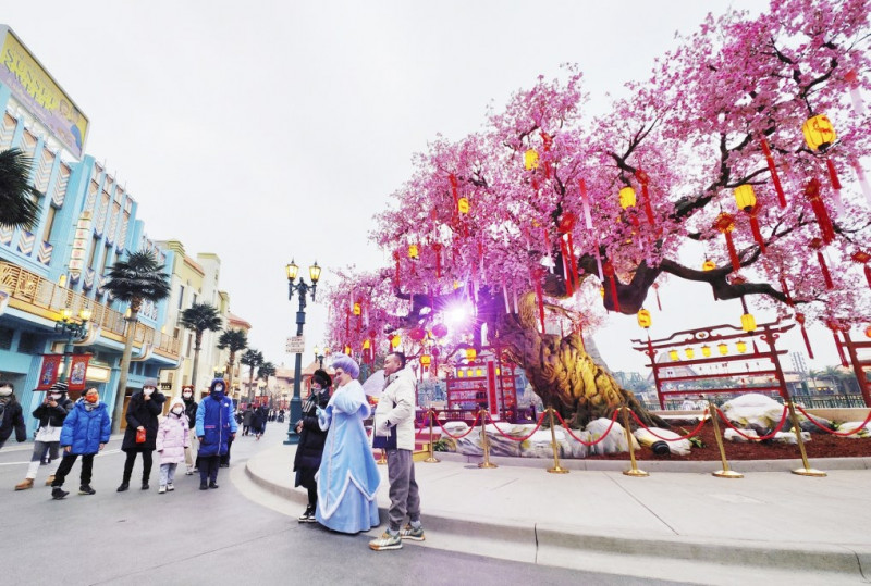 春节期间,北京环球度假区内外装饰一新,从城市大道到环球影城公园,到处都洋溢着浓浓的中国年味儿。在北京环球城市大道,五个高达六米并绘有标志性元素角色的巨型落地灯笼坐落在环球广场上,将浓郁的新春气氛传递给每一位即将入园的市民游客。同样,北京环球影城主题公园里也已经人头攒动,农历中国新年的主题装饰随处可见。公园入口处的竹子树下,兔子村村民和憨态可掬的阿宝一起迎接游客的光临。好莱坞大道天幕下,一排排红彤彤的灯笼让游客从入园起就沉浸在春节红火喜庆的热闹氛围中。通往小黄人景区的路上,红色的卡通龙和戴着兔耳朵的小黄人将圆形拱门衬托得年味十足。备受游客喜爱的“环球影城新春秀”里,增加了两只以“环球”命名的全新瑞狮——“吉祥环环”“如意球球”,它们与伍哈兔等十多位电影角色、演员一起在欢天喜地的热闹氛围中嬉戏起舞,和游客共庆热闹欢腾的中国年。