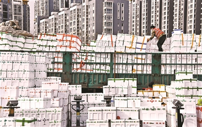 入冬以来,北京新发地市场从各地调运新鲜蔬菜供应北京市场,保障市场供应充足、价格稳定。图为昨日大批新鲜蔬菜运抵新发地市场。文并图/新华社