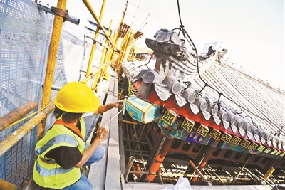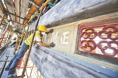 正阳门箭楼南望景观视廊是中轴线沿线环境改造提升的重要项目。近期,东城区将南起珠市口,北至正阳门箭楼,东到前门东路,西到东城区与西城区交界的范围纳入改造区域深入开展设计研究。整体项目将以前门五牌楼油饰翻新、前门大街沿线第五立面、景观照明、牌匾标识改造作为工作重点,全面开展景观视廊沿线的环境整治提升。预计大北照相馆、五牌楼彩绘油饰翻新工作将会在9月底至10月中旬完工,正阳门箭楼南望景观视廊环境改造提升将于年底前亮相。图为工作人员正在对前门五牌楼进行油饰彩绘翻新。