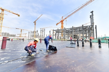 整个场馆轮廓已初具雏形,工人正在为地下车库顶板做防水。记者 唐建/摄