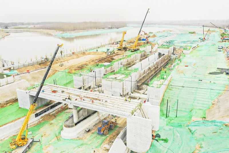 北运河榆林庄船闸两侧的主体轮廓已经成型,首批人字闸门开始安装。记者 常鸣/摄