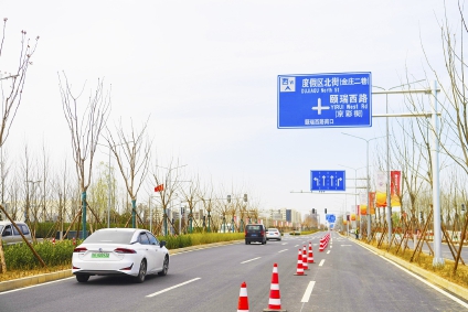 附属设施安装完成,度假区北街正在为环球主题公园开园前的交通压力测试做最后的验收、调试准备。记者 党维婷/摄