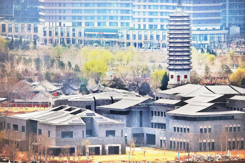 在北京国际财富中心园区,屋顶灰色光伏板与古色古香的建筑完美融合。记者 白继开/摄