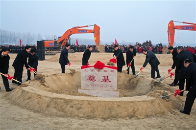 新京报讯 昨日,随着中国民航局局长李家祥一声令下,现场等待的一排挖掘机立即启动,首都新机场工程正式开工,开工区域为机场两条主跑道西一、西二跑道的北段。