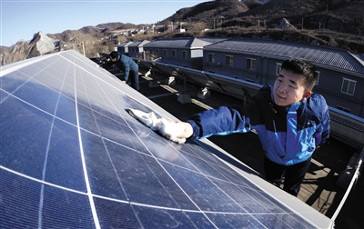 昨日,北京市妙峰山镇水峪嘴村,工作人员在清洁村委会冬季供热和办公用电的太阳能电池板。近年来,门头沟区妙峰山镇在辖区内15个村庄进行能源结构调整,通过“煤改电”、平价液化气供应、农村清洁煤集中供热、太阳能和地热能等新型能源的应用,既减轻农民生活用能负担,同时有效治理大气污染。 新华社记者 李欣 摄