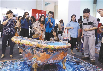 五一假期,市民在艺术北京博览会现场欣赏韩国艺术作品。5月1日,2015第十届艺术北京博览会在全国农业展览馆开幕。本届博览会吸引了来自19个国家和地区的近160家画廊和艺术机构亮相,展出了包括书画、雕塑、瓷器、家具、装置、摄影、珠宝、录像等形式的当代艺术作品。