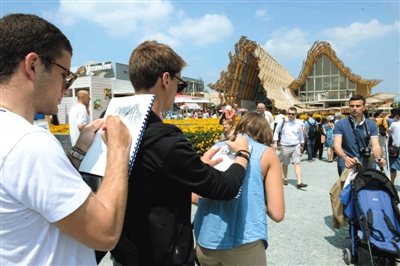 游客在米兰世博会中国馆外写生。当地时间30日上午,主题为“美丽北京 绽放世博”的北京周,在米兰世博会中国馆拉开帷幕。北京周将从5月30日持续到6月3日,历时5天,期间,京剧、北京烤鸭、北京胡同、卢沟桥狮子等具有浓郁京味的元素悉数亮相中国馆。中国馆外园林景观的舞台上,将以视频和图片等多种方式,连续5天宣传推广北京都市农业、文化旅游、时尚设计等相关产业。