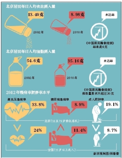 8年时间里,北京人每天的食盐摄入量从原来的13.4克,降到8.98克,减少了4.42克,油脂的日摄入量更是在8年间减少了近20克。这意味着以往“口重”的北京人饮食变得清淡,炒菜也少了“油水”。不过,居民油盐的实际摄入量仍高于推荐标准。