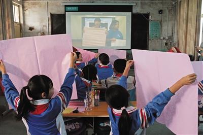 新京报讯 (记者孔悦)昨日上午,河南省新乡市辉县高庄乡金章小学五年级的19名学生坐在教室新安装的投影幕布前,体验了由北京五名优秀教师教授的四堂在线直播课程。在新京报、淘宝教育及辉县教育部门的热心帮助下,这所乡村学校开始尝试用在线教育解决师资不足的难题。