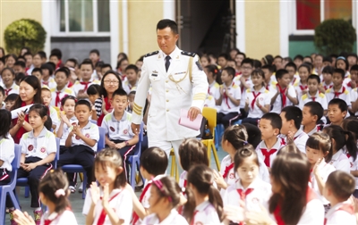 昨日,海淀区双榆树第一小学,参加9·3大阅兵的海军军乐团号手赵宇飞受邀参加开学典礼。当日,北京中小学正式开学,新学期的第一课中,有不少学校紧扣热点,邀请到了在9·3大阅兵中受阅的官兵,现场讲述训练的故事,激励孩子们刻苦努力。受开学等影响,昨天早高峰全市路网拥堵指数8.6,二环内最高峰值达到9.4,众多学校集中的西城区拥堵指数达到9.6,接近爆表值(10)。交通部门提示,本周五恰逢机动车尾号4、9限行,晚高峰预计将持续到晚间10点以后。新京报记者 浦峰 摄