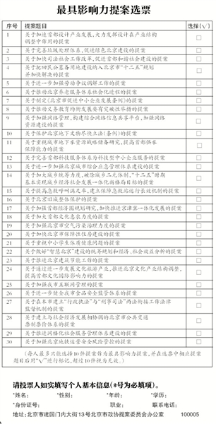 新京报讯 (记者邓琦)市政协昨日召开“最具影响力提案评选”新闻发布会,将从2010年-2014年立案的6279件提案中,评选出10大最具影响力提案。目前,30件入围提案已向社会公布。9月10日至9月20日,市民可通过邮寄纸质选票或网上投票,参与评选。