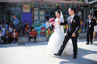 时间:9月26日上午 地点:顺义区大江洼村光爱学校 事件:学校收养的流浪儿丁啸与志愿者张爱灵举办婚礼