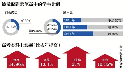 在中高考新政影响下,北京考生有哪些收获?昨日,门头沟区、密云县、延庆县等远郊区县教委负责人透露,所在区县考生通过中高考录取受益了。