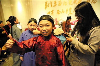新京报讯 (记者杜丁)2015年12月28日,东城区灯市口小学优质教育资源带首届“追逐梦想光彩绽放”校园戏剧节闭幕式成果汇报演出在青蓝剧场举行。学生戏剧社上演了话剧《茶馆》片段,儿童剧《森林爷爷》、《妙咪出走记》等。据了解,灯小已与中国儿艺等单位结为高参小项目共建关系,戏剧课程为学校校本选修课程。通讯员 周良 摄