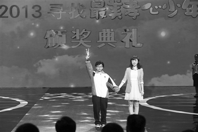 新京报讯 (记者李禹潼)“他(她)们孝敬父母、长辈,担当家庭责任,学会自强和坚持。”近日,由中央电视台主办的“寻找最美孝心少年”公益活动颁奖典礼在京举行。10人获选2013年度“最美孝心少年”,20人被评为“特别关注孝心少年”。