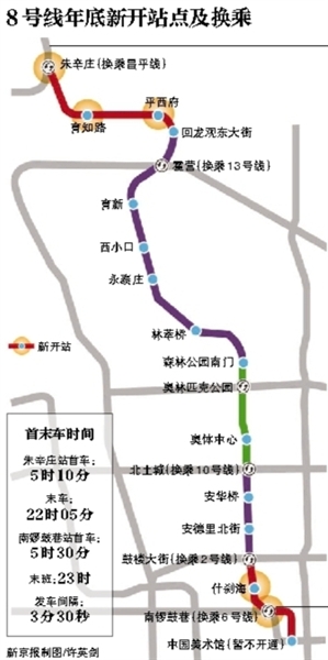 新京报讯 (记者刘春瑞)彩绘、中国红、老北京市井图……8号线南锣鼓巷京味十足。昨日,来自北京市交通委的消息,本周末地铁8号线两段新线路将开通试运营。两条新线将与既有8号线贯通运营,北至朱辛庄与昌平线换乘,南至南锣鼓巷站与6号线换乘。